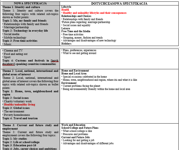 Niniejsze zestawienie stanowi podsumowanie analizy nowej specyfikacji GCSE z innych języków europejskich; niemieckiego, francuskiego i hiszpańskiego. Stanowi ono ważne źródło informacji, gdyż może wyznaczać kierunek zmian w specyfikacji nauczania języka polskiego na poziomie GCSE.