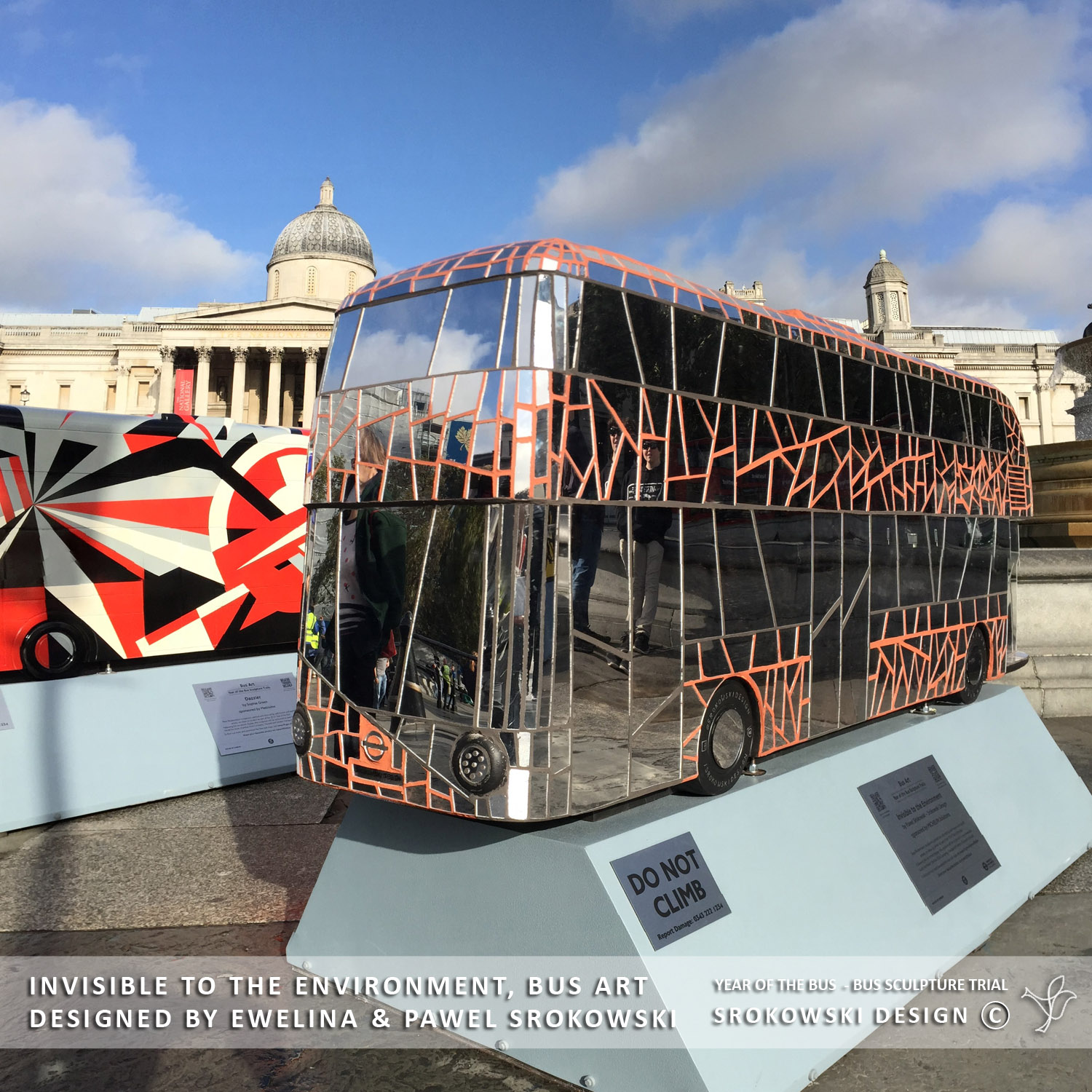 PS: 17 października na Trafalgar Square w Londynie odbyła się prezentacja wykonanych autobusów. Ponad 20 rzeźb zostało wyeksponowanych na placu. Przedstawiciele różnych mediów mieli okazję spotkać się z artystami i przeprowadzić wywiady. Nie zabrakło również sponsorów, którzy sfinansowali wykonanie wszystkich rzeźb. Jesteśmy dumni, że nasz projekt cieszył się dużym zainteresowaniem. Zarówno dzieci, jak i dorośli chętnie fotografowali naszą pracę lub pozowali do zdjęć przy “niewidzialnym” autobusie. Po raz pierwszy w świetle dziennym, na otwartym terenie, przekonaliśmy się, że idea “odbijania otaczającego świata” sprawdziła się perfekcyjnie. Nasza rzeźba wyglądała unikatowo z każdego punktu obserwacji. Następnie, tego samego dnia po południu, wszystkie autobusy zostały przetransportowane do miejsca docelowej ekspozycji. Na stronie organizatora konkursu można znaleźć mapki z trasą zwiedzania (https://www.tfl.gov.uk/campaign/sculpture-trails). Nasz autobus wyeksponowany jest na Stratford, w parku olimpijskim między stadionem a centrum handlowym Westfield.